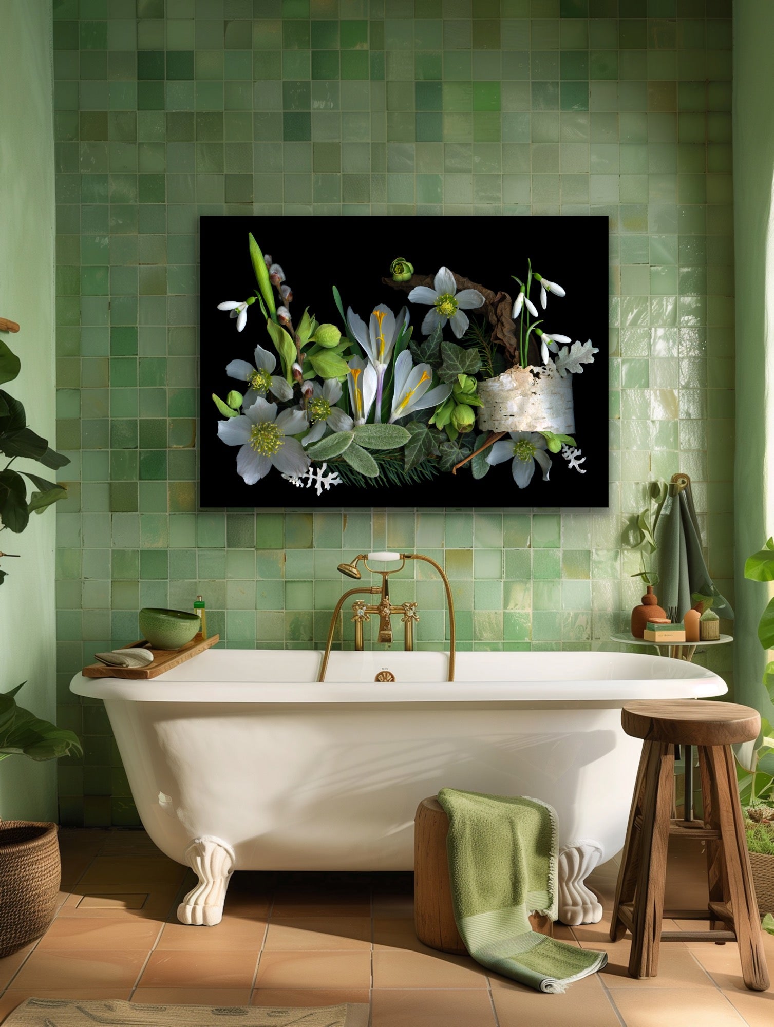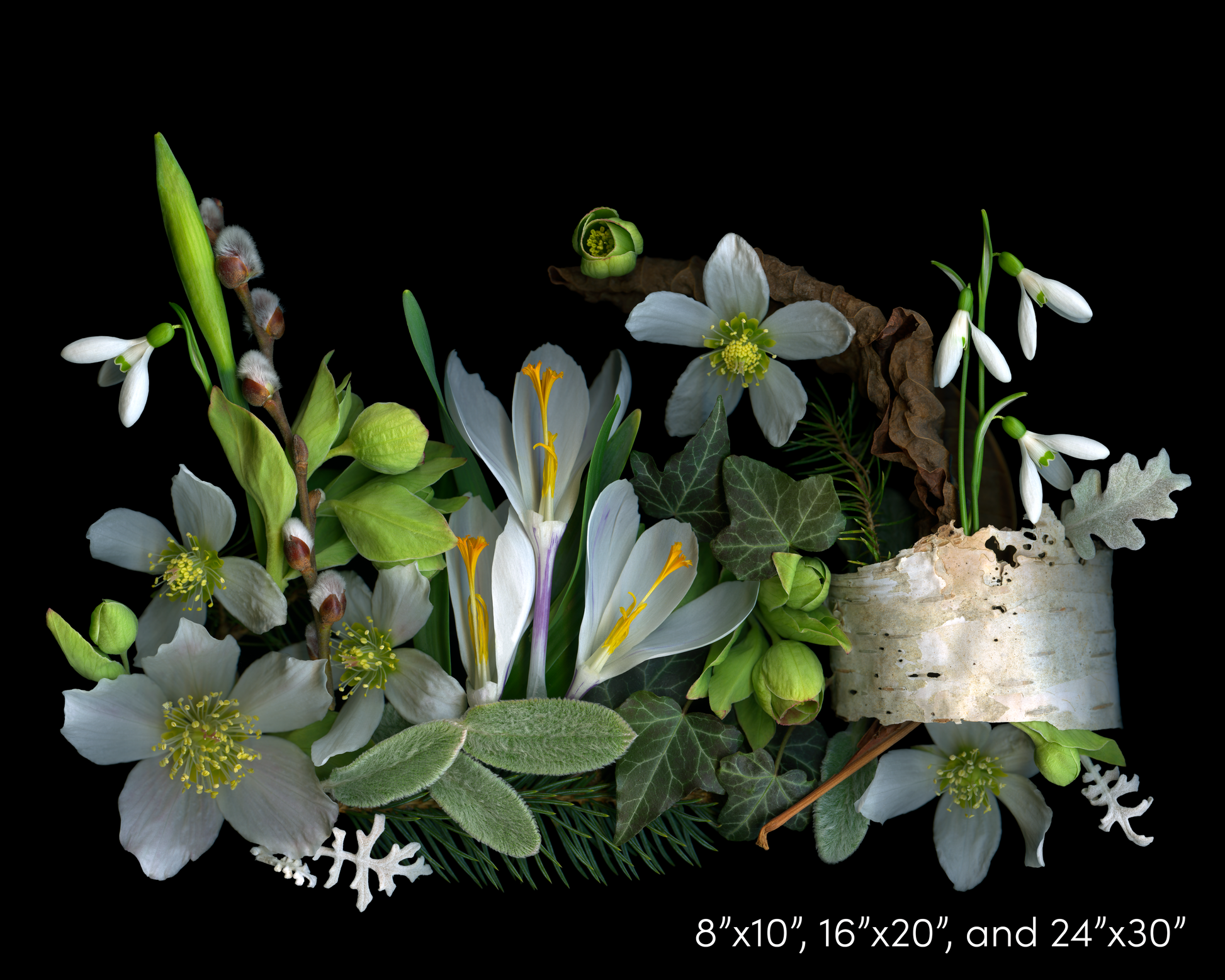 ‘Crocus and Birch Medley’ captures the soft awakening from winter’s sleep. Snowdrops stand tall as they rise up from shimmering birch bark. A fallen leaf reminds us of the past season, while hellebores and crocus whisper the much anticipated transition into spring.